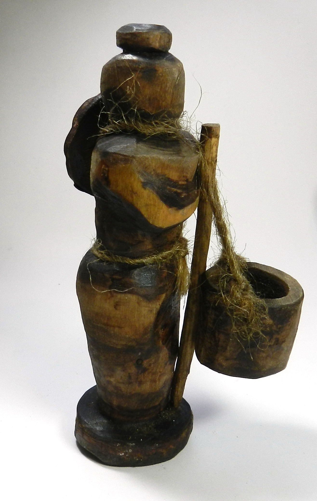 5 1/2″ tall, hand carved naturally gathered choke cherry wood in the form of a maiden with water bucket. Detailed with walnut stain.