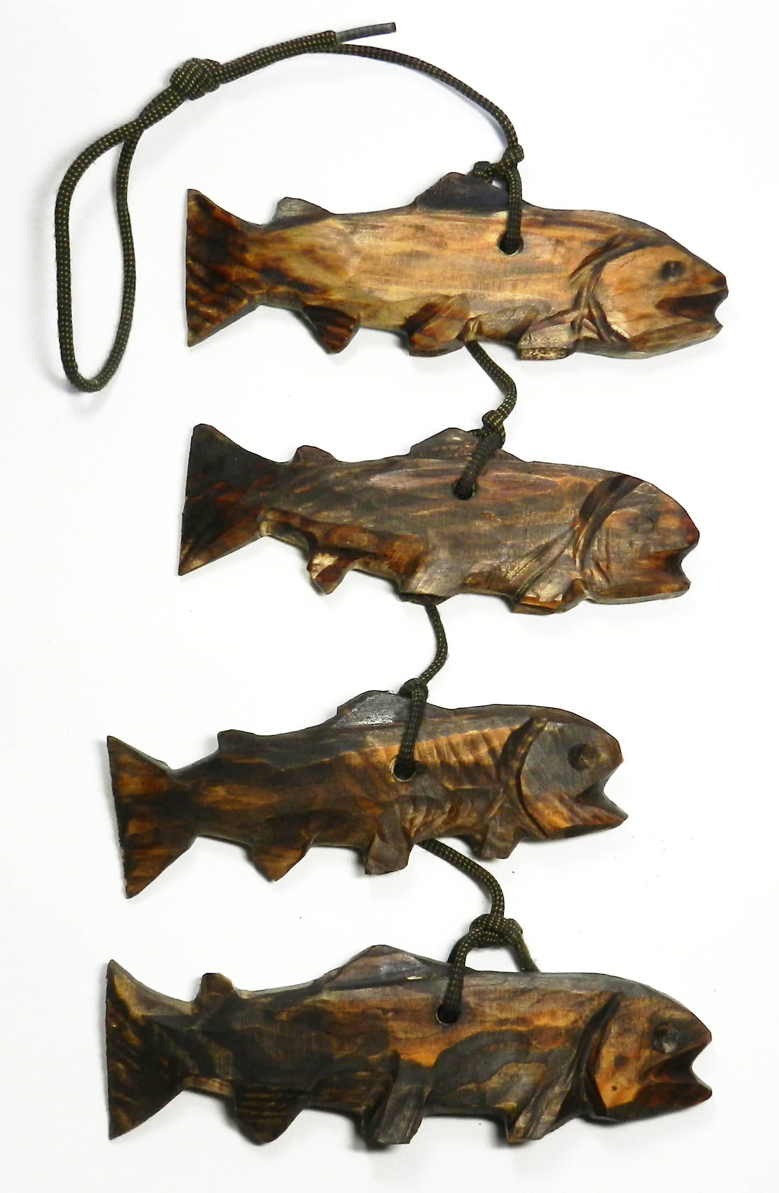 Hand carved re-purposed (from a vintage chair) pine wood. 4 trout strung together for hanging. 7 inch long fish.